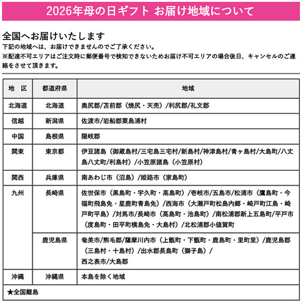 お届けできない地域はこちらからご確認ください。2026年母の日ギフト お届け地域について ※配達不可エリアはご注文時に郵便番号で検知できないためお届け不可エリアの場合後日、キャンセルのご連絡をさせて頂きます。