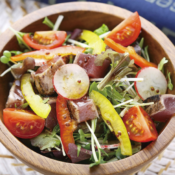 一本釣りで漁獲した鰹を土佐伝統の藁焼きでたたきにしました。塩・たれの食べくらべを楽しめます。