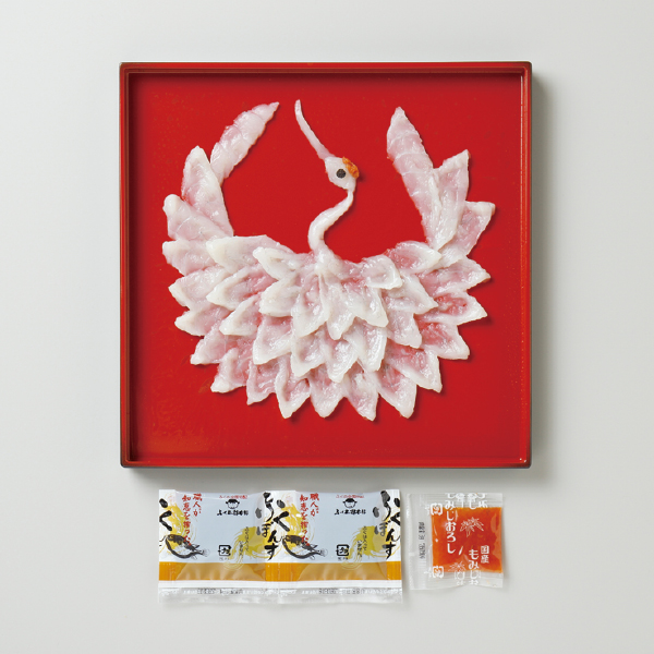 まふぐ刺身鶴盛り50g(21cm角プラスチック皿)、ポン酢10g×2、モミジオロシ3g、「お母さんありがとう」のメッセージ入りしおり