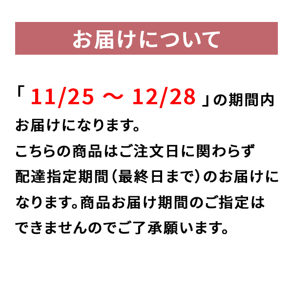 こちらの商品はご注文日に関わらず配達指定期間(最終日まで)のお届けとなります。商品お届け期間のご指定はできませんのでご了承願います。