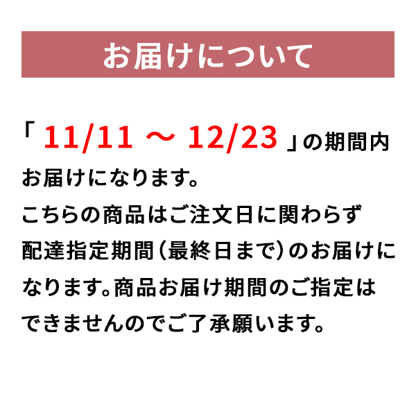 こちらの商品はご注文日に関わらず配達指定期間(最終日まで)のお届けとなります。商品お届け期間のご指定はできませんのでご了承願います。