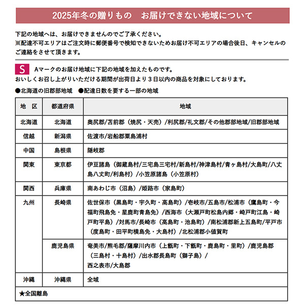 お届けできない地域はこちらからご確認ください。2025年冬の贈りもの お届け地域について ※配達不可エリアはご注文時に郵便番号で検知できないためお届け不可エリアの場合後日、キャンセルのご連絡をさせて頂きます。
