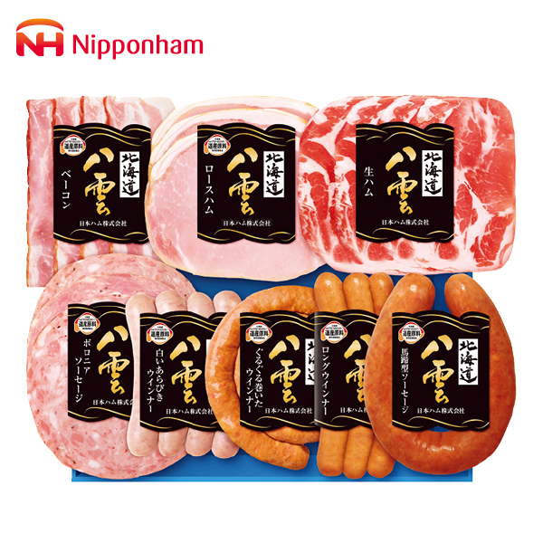 ボロニアソーセージ56g、肩ロース生ハム30g、ベーコンスライス39g、白いあらびきウインナー95g、ロースハムスライス48g、馬蹄型ソーセージ128g、ロングウインナー86g、ぐるぐる巻いたウインナー122g
