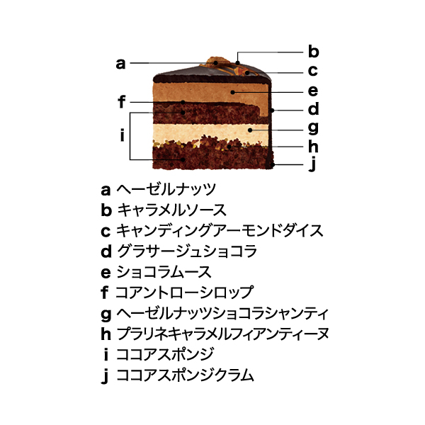 ビターなショコラムース、ヘーゼルナッツショコラシャンティ、キャラメルソースを重ね、食感のアクセントにアーモンド、香りづけにコアントローを使用した贅沢なショコラケーキです
